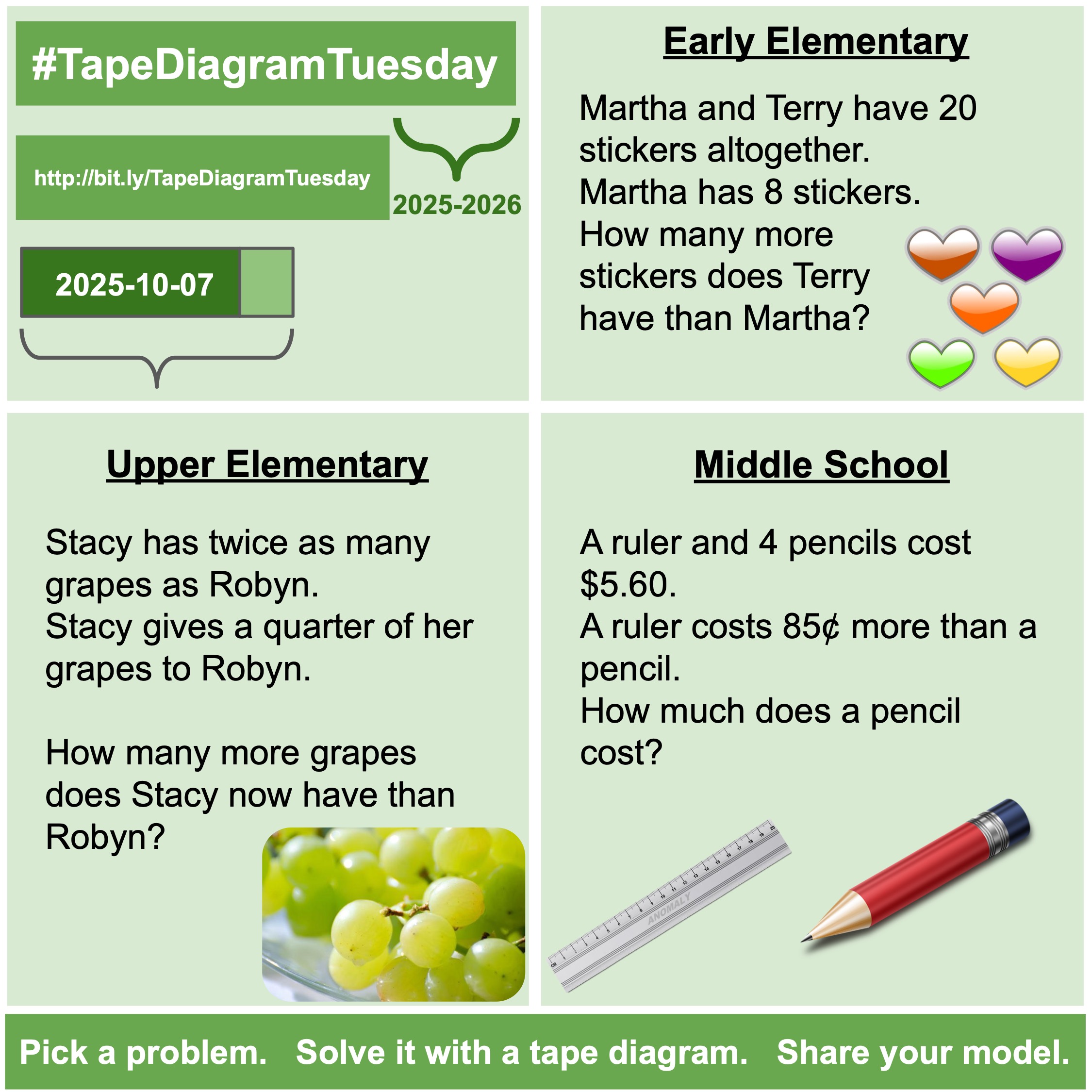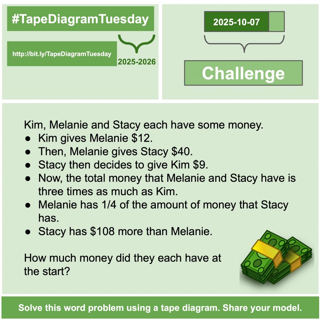 October 7, 2025 #TapeDiagramTuesday Posted on October 7, 2025 Posted by dhabecker Leave a comment Posted in TapeDiagramTuesday