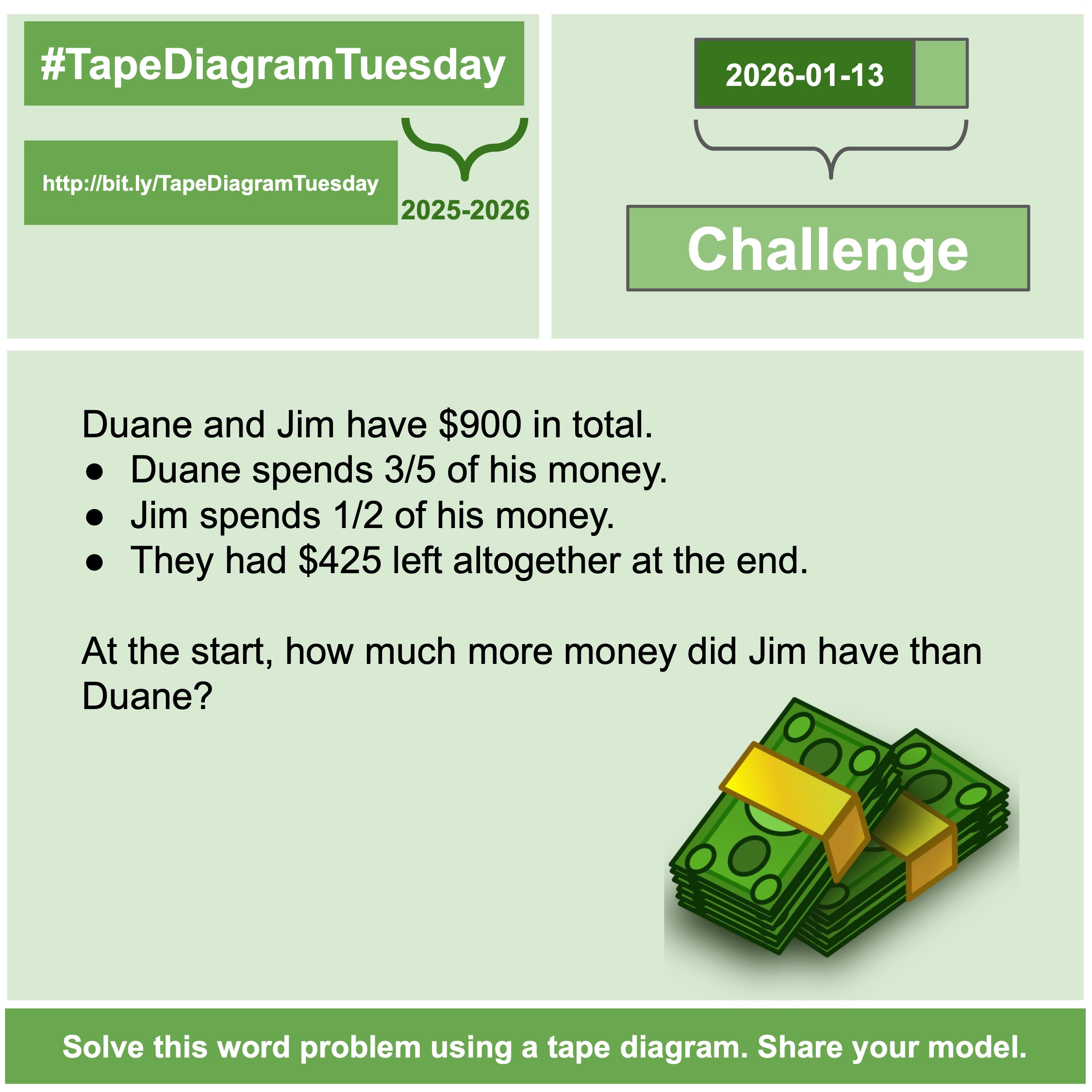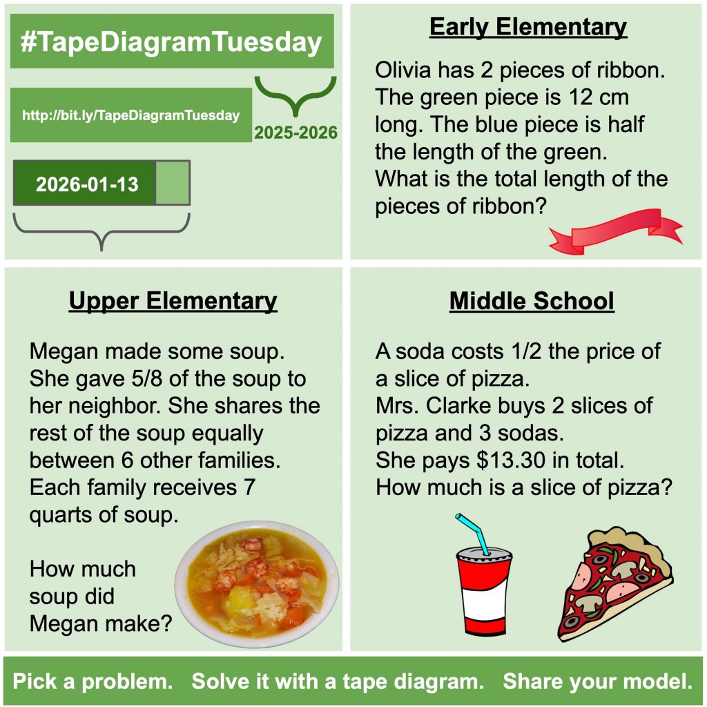 January 13, 2026 #TapeDiagramTuesday Posted on January 13, 2026 Posted by dhabecker Leave a comment Posted in TapeDiagramTuesday