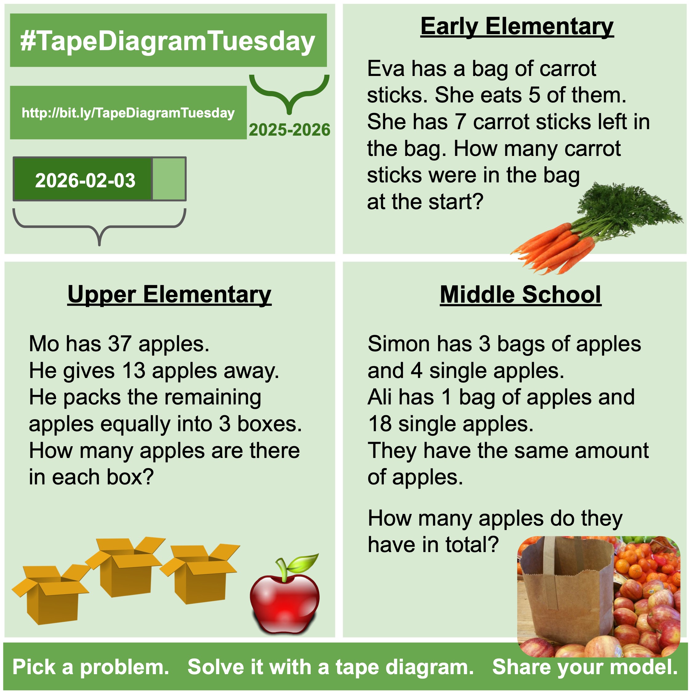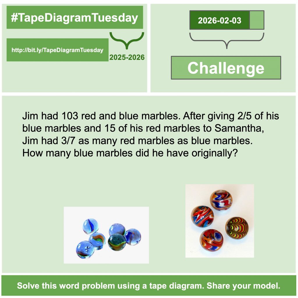 February 3, 2026 #TapeDiagramTuesday Posted on February 3, 2026 Posted by dhabecker Leave a comment Posted in TapeDiagramTuesday
