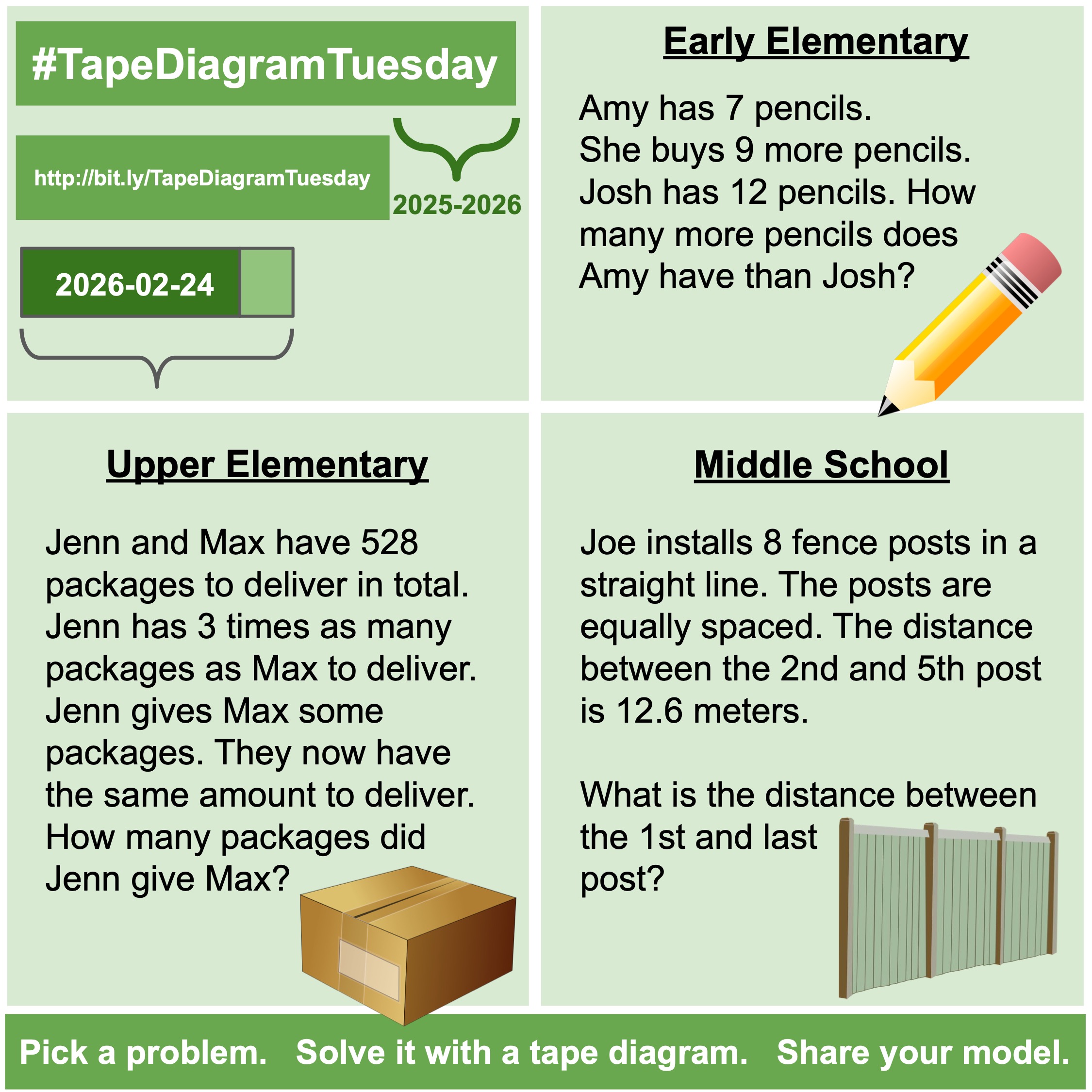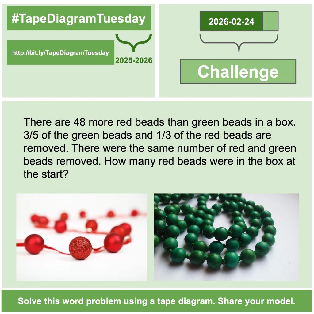 February 24, 2026 #TapeDiagramTuesday Posted on February 24, 2026 Posted by dhabecker Leave a comment Posted in TapeDiagramTuesday